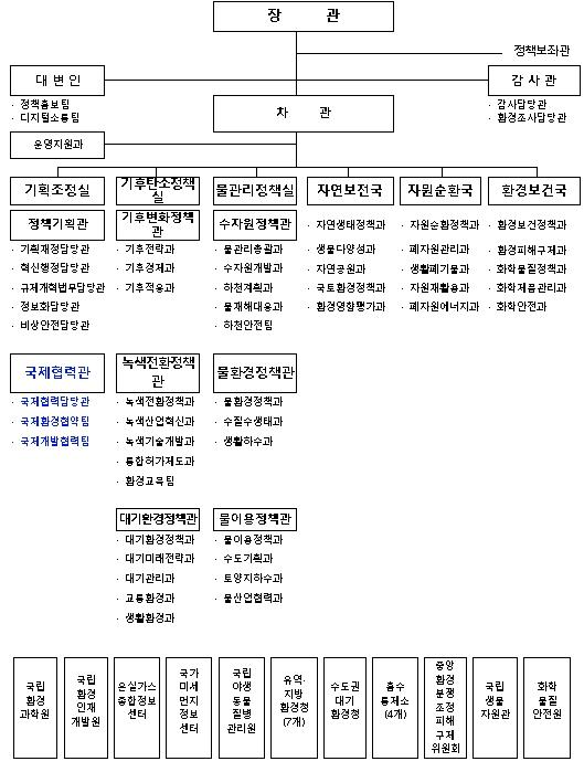 국제협력관 신설의 주요 내용은 우선, 기획조정실 내에 국제협력관을 두고 하부조직으로 국제협력담당관, 국제환경협약팀, 국제개발협력팀을 둔다.