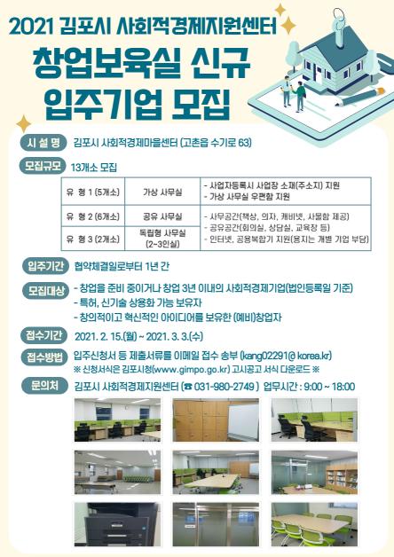 입주를 희망하는 기업(개인, 단체 포함)은 김포시(고시공고란) 또는 김포시사회적경제지원센터 누리집에서 신청서를 다운받아 작성 후 이메일로 제출하면 되며 자세한 사항은 김포시 사회적경제지원센터로 문의하면 된다.