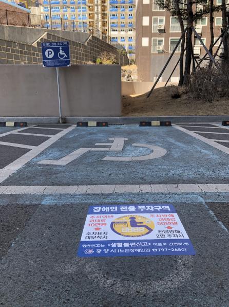 광양시는 장애인전용주차구역 위반행위 빈발지역과 공동주택 130개소에 장애인전용주차구역 식별이 용이하도록 바닥보조마크를 설치해 시범 운영한다.