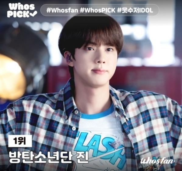 진은 글로벌 케이팝 팬덤 플랫폼 ‘후즈팬(Whosfan)’에서 지난 15일부터 21일까지 진행한 '하늘이 내린 아이돌 최강 웃수저(주변에 웃음을 주는 사람)는 누구?'라는 투표에서 37.68%의 득표율로 1위를 차지했다.