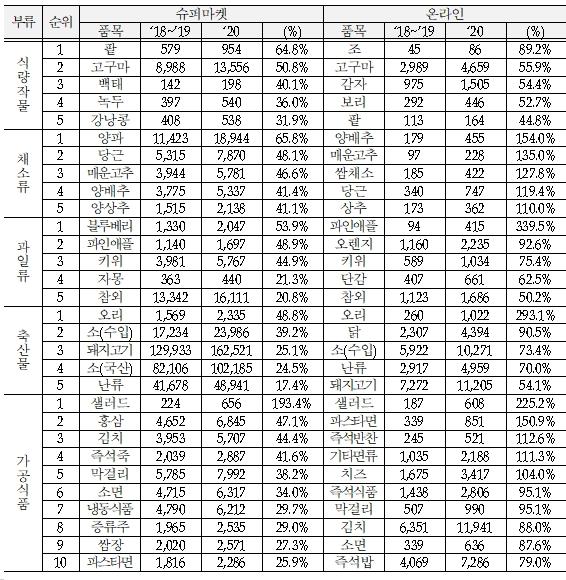 구색과 가격 경쟁력을 갖춘 슈퍼마켓에서 신선 농산물(1.2%p)과 가공식품(3.4%p)을 구매하는 비중이 증가했다.
