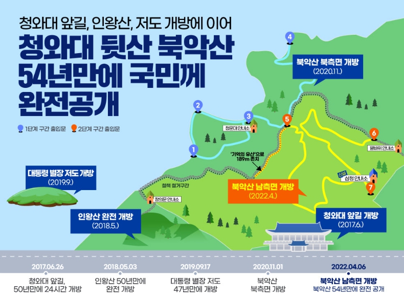 ‘북악산 전면 개방’은 문재인 대통령이 대선 후보였던 2017년 “북악산, 인왕산을 전면 개방해 시민들에게 돌려주겠다”는 국민과의 약속을 완수했다 데 큰 의미가 있다. 이로써 1968년 북한 무장간첩들이 청와대 기습을 시도한 이른바 ‘김신조 사건’ 이후 54년만에 청와대 인근 전 지역이 국민들의 품으로 온전히 돌아가게 되었다.
