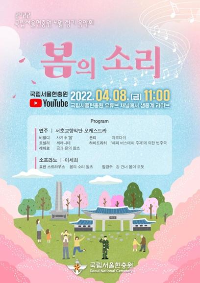 이번 음악회는 ‘봄의 소리’라는 주제로 4월 8일 11시부터 1시간 동안 현충원 유튜브 채널을 통해 생중계할 예정이다.