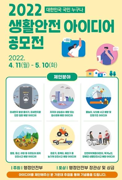 [한국쇼핑몰뉴스, 최영진기자] 행정안전부는 생활 속에서 발생할 수 있는 안전 문제에 대한 국민들의 제안을 받아 연구개발을 통해 해결 방법을 찾는 ‘생활안전 아이디어 공모전’을 4월 11일부터 5월 10일까지 개최한다고 밝혔다.