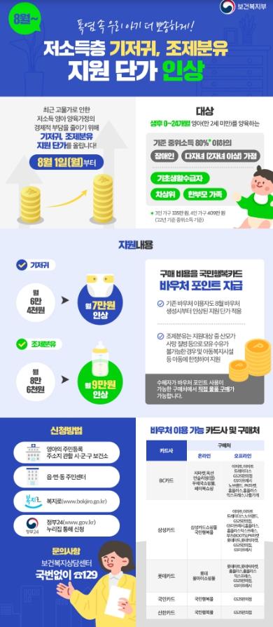 최근 고물가로 인한 저소득 영아 양육가정의 경제적 부담을 줄이기 위해 8월부터 기저귀, 조제분유 지원 단가를 올립니다.