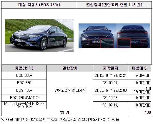 둘째, 메르세데스벤츠코리아㈜에서 수입·판매한 EQS 450+ 등 5개 차종 438대(판매이전 포함)는 견인고리 연결 나사산의 코팅 불량으로 견인고리 연결 시 정상 깊이까지 체결되지 않아 분리될 수 있는 안전기준 부적합 사항이 확인되어 우선 수입사에서 자발적으로 시정조치(리콜)를 진행하고, 추후 시정률 등을 감안하여 과징금을 부과할 계획이다.
