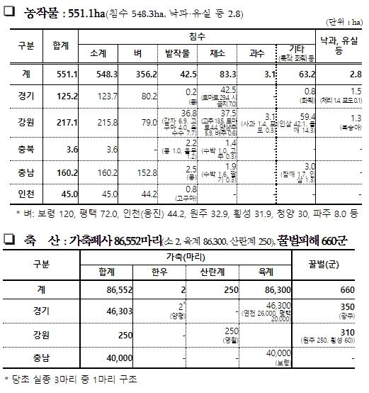 벼(356ha)의 경우, 장기간(약 3일) 침수 시 생육에 영향이 있을 수 있으나 현재 강원, 인천은 퇴수가 완료되었고, 경기권은 내일 중 퇴수 완료 예정이며, 충청권은 금일부터 내일 오전까지 비가 내릴 전망으로 적기 퇴수시 피해는 크지 않을 것으로 보인다.