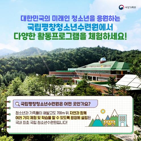 - 청소년과 가족들이 해발고도 700m 위 자연과 함께 여러 가지 체험 및 학습을 할 수 있도록 평창에 설립된 국내 최초 국립 청소년 수련원입니다!
