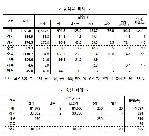 농림축산식품부는 8월 8일 이후 지속된 호우로 농작물 1,773.8ha, 가축 폐사 81,879마리, 꿀벌 1,099군, 저수지 둑 유실 3개소 등의 피해가 집계(8.16. 08시 기준)되었다고 밝혔다.