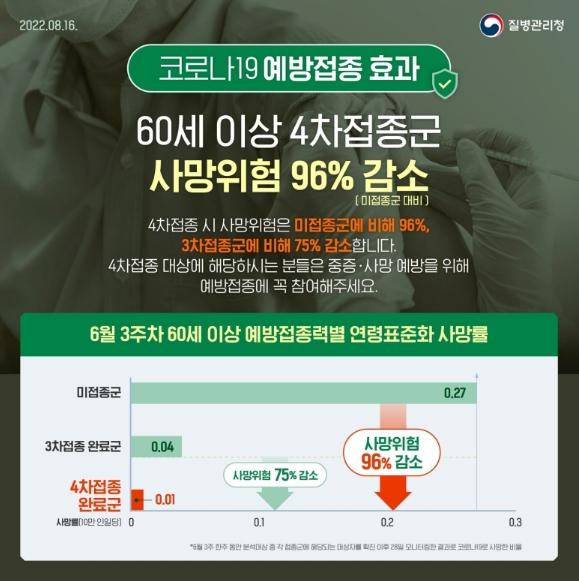 질병관리청, 60세 이상 4차접종군 사망위험 96% 감소
