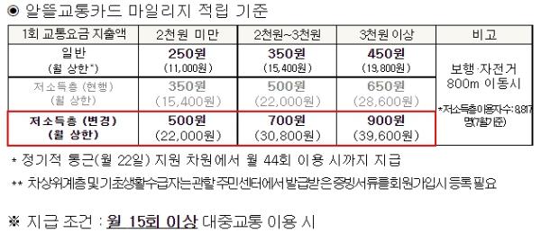 [한국쇼핑몰뉴스, 최영진기자] 국토교통부 대도시권광역교통위원회는 추석 민생안정대책의 일환으로 8월부터 12월까지 한시적으로 저소득층(차상위계층, 기초생활수급자)에 대한 알뜰교통카드 마일리지 지원을 확대한다고 밝혔다.
