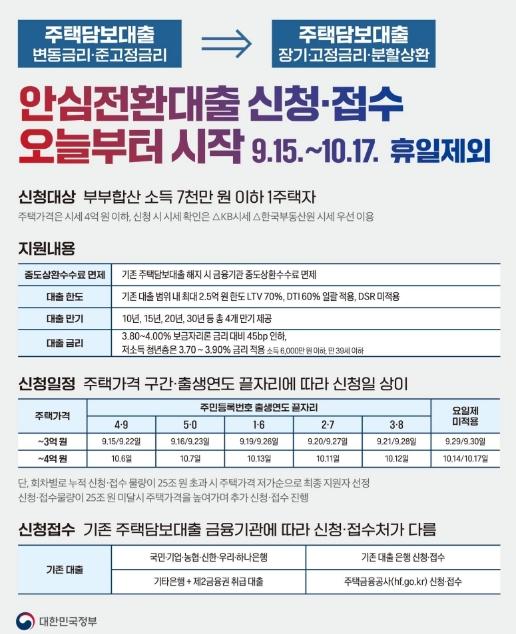 [한국쇼핑몰뉴스, 최영진기자] 기존 주택담보대출의 변동금리·준고정금리를 장기·고정금리·분할상환으로 전환해주는 안심전환대출 신청·접수가 시작됐습니다.