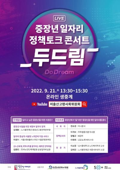 [한국쇼핑몰뉴스, 최영진기자] 대통령직속 저출산고령사회위원회는 9월 21일 오후 1시 30분 서울시50플러스재단 중부캠퍼스 1층 50+의 서재에서 “중장년 일자리 정책토크 콘서트: 두드림(Do Dream)”을 개최한다.