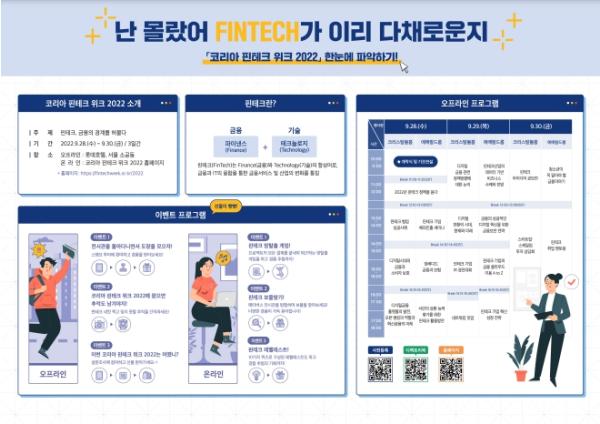 [한국쇼핑몰뉴스, 최영진기자] 제4회 코리아 핀테크 위크 2022(Korea Fintech Week 2022)는 국내외 핀테크 기업과 핀테크 전문가들이 참여하는 글로벌 박람회로 9.28일부터 9.30일까지 3일간 온·오프라인으로 동시에 개최된다.