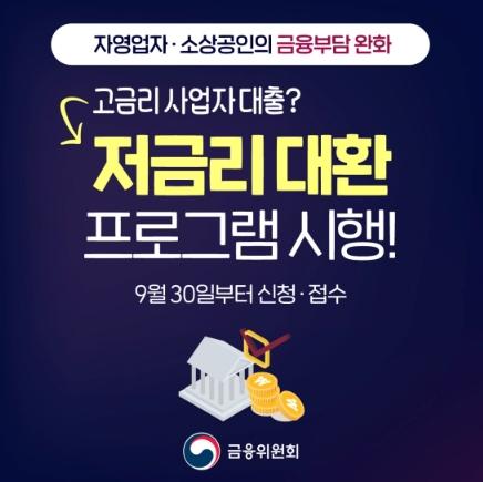 [한국쇼핑몰뉴스, 최영진기자] 9월 30일부터?코로나19로 피해를 입은 자영업자·소상공인의 금융부담을 낮추기 위해 연 7% 이상 고금리 사업자 대출을 저금리로 전환하는 대환 프로그램이 시행됩니다.