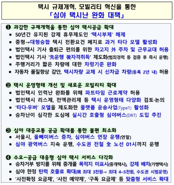 국토부는 1)과감한 택시 규제개혁, 2)새로운 유형의 모빌리티 확대, 3)심야 대중교통 확대, 4)택시 서비스 활성화 등을 골자로 한 「심야 택시난 완화 대책」을 마련하였으며, 주요 내용은 다음과 같다.