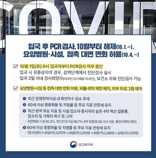 [한국쇼핑몰뉴스, 최영진기자] ◆ 10월 1일(토) 0시 입국자부터 PCR 검사 의무 중단