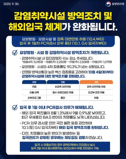 - 안정된 방역상황과 높은 백신 접종률을 고려하여 10월 4일(화)부터 감염 취약시설에 대한 방역조치를 완화힙니다.