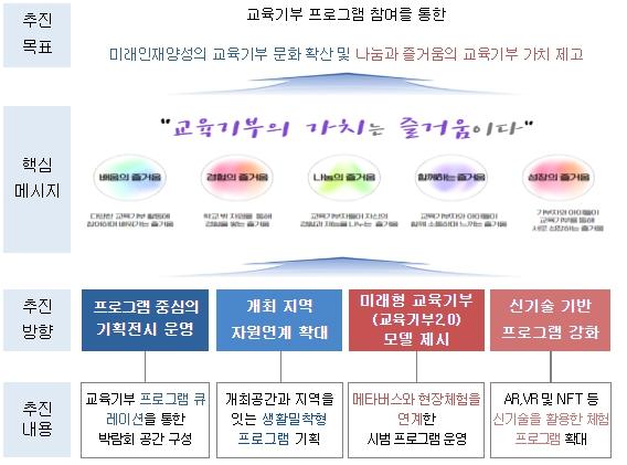 이번 박람회는 “교육기부는 즐거움이다”를 주제로 코로나19의 영향으로 침체됐던 교육기부에 활기(색)를 불어넣고, 색을 활용한 다양한 체험과 전시 프로그램이 제공하여 관람객들이 일상의 소중함과 행복을 느낄 수 있도록 기획했다. ※ '붙임' 참조