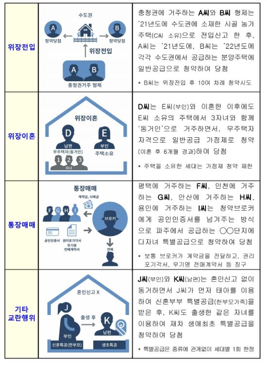 주택 공급질서 교란행위로 적발된 주요 유형을 보면, ① (위장전입) 해당지역 거주자 또는 무주택세대구성원의 청약자격을 얻기위해 주소지만 옮겨서 청약하는 방식의 부정청약 128건, ② (위장이혼) 특별공급 횟수제한 또는 재당첨제한을 회피하기 위해 허위로 이혼(등본 상 ‘동거인’)하고 청약하는 방식의 부정청약 9건,혼인신고 없이 동거하면서 태아를 이용하여 신혼특공(母)을 받은 후, 다시 출생한 자녀(태아)를 이용하여 생초특공(父)을 받은 사항 2건, ③ (통장매매) 브로커와 청약자가 공모하여 금융인증서 등을 넘겨주어 대리청약하거나, 당첨 후 대리계약 하는 방식의 부정청약 29건, ④ (불법공급) 사업주체가 당첨자의 특별공급 횟수제한 또는 재당첨제한 사실을 통보(한국부동산원)받고도 당첨자와 공급계약 체결 2건 등이다.