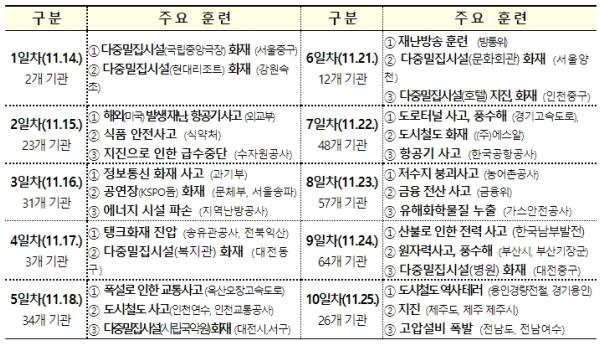 지난 2년간 코로나19로 축소·간소화됐으나, 올해는 중앙부처, 지방자치단체, 공공기관 등 300개 기관 주관으로 민간기업, 단체 등 2,680개 유관기관이 참여하여 총 1,433회 훈련을 실시할 예정이다.