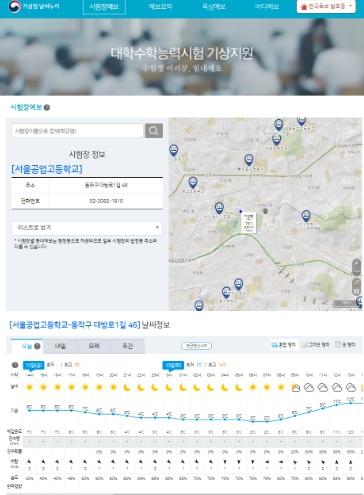 15일 오후(12~18시)부터 밤(18~24시)사이 북한 지방을 통과하는 약한 기압골의 영향을 받아 수도권과 강원 영서, 충남권 북부에는 비(높은 산지 비 또는 눈)가 조금 내리고, 충남권 남부, 충북, 전북, 경북 북부에는 빗방울이 떨어질 것으로 전망하면서,강수량은 1 mm 내외로 적겠지만 내린 비로 인해 도로가 미끄럽고, 16일 새벽 기온이 영하로 내려가는 내륙지역 중심으로는 내린 비가 도로에 얼어붙을 가능성이 있겠으니, 수험생 이동 시 교통안전에 각별히 유의해 줄 것을 당부했다.