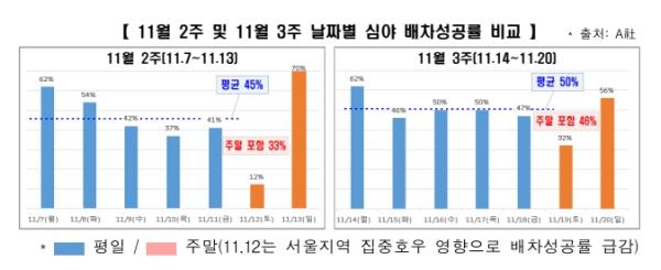 국토교통부는 “서울지역 11월 3주 평일 심야(11.14∼11.18, 22시∼03시) 배차성공률은 50%(주말 포함 46%)로, 11월 2주 45%(주말 포함 33%)에 비해 상승했다”고 분석했다.