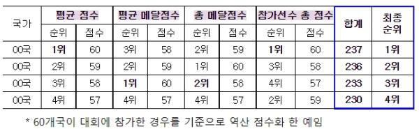 우리나라는 4개 지표를 대회 참가국 수 기준으로 점수화한 결과 208점을 얻어 210점을 획득한 중국에 이어 종합 2위를 차지했다.