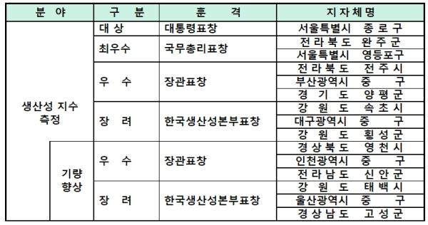 최우수상(국무총리 표창)에는 전라북도 완주군, 서울특별시 영등포구가 수상했으며, 생산성 대상 우수상(행정안전부장관 표창)에는 전라북도 전주시, 부산광역시 중구, 경기도 양평군이 선정됐다.