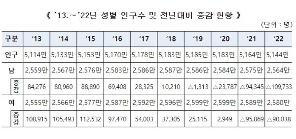 성별로 보면, 남자 인구 감소는 4년 연속 계속됐으며, 여자 인구 또한 2021년에 이어 2년 연속 감소 추세를 보였다.