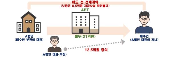법인대표 자녀가 법인 명의 아파트를 21억원에 매수하면서 기존 전세보증금 8.5억원과 법인대표로부터 증여받은 12.5억원으로 자금을 조달했는데,매도 전 매도인(임대인)과 매수인(임차인)이 체결한 전세보증금 이체내역과 법인의 장부처리 내역 등이 확인되지 않아 법인자금 유용 및 편법증여 의심으로 국세청에 통보했다.