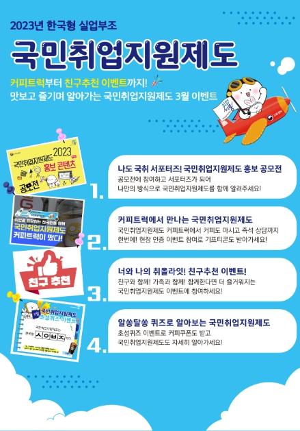 3.9일과 3.23일 고용노동부 페이스북을 통한 초성퀴즈 이벤트에 참여할 수 있으며, 매회 30명을 추첨하여 커피 쿠폰을 지급한다. 초성 퀴즈는 12월까지 지속해서 매월 둘째, 넷째주 목요일에 진행될 예정이다.