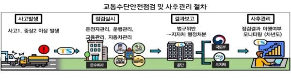 국토교통부 구헌상 종합교통정책관은 “'21년 교통수단 안전점검 기준 강화의 제도개선을 통해 실시한 '22년 점검 결과가 운수회사의 교통사고 감소에 기여한 것으로 나타났다”면서, “운수회사의 교통사고 감소를 통한 국민의 안전 강화를 위해 지방자치단체, 교통안전공단 등 관계기관과 협의하여 교통수단 안전점검을 지속적으로 실시하는 등 안전관리를 강화해 나갈 것”이라고 밝혔다.
