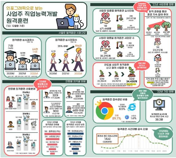 [한국쇼핑몰뉴스, 최영진기자] 한국산업인력공단은 2022년도 사업주 직업능력개발 원격훈련 현황의 인포그래픽 안내자료를 발표했다.