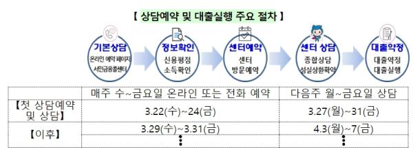 첫 상담예약 신청은 3.22일부터 24일까지 온라인 예약 페이지 또는 전화 예약(서민금융콜센터 국번없이 1397)을 통해 가능하며, 다음주인 3.27(월)~31(금)동안 예약 일정에 따라 상담이 진행된다.