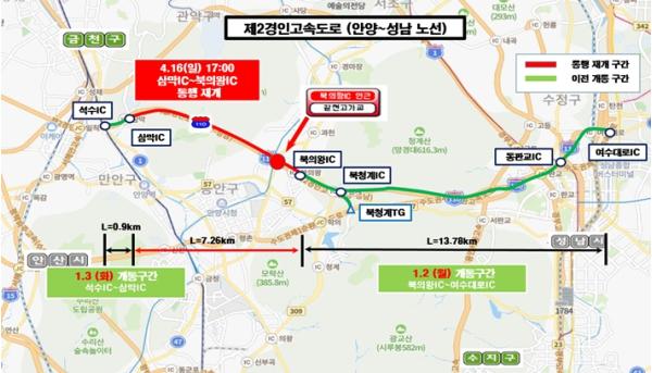 [한국쇼핑몰뉴스, 최영진기자] 국토교통부는 방음터널 화재사고로 그간 통행이 제한됐던 제2경인고속도로 삼막IC~북의왕IC, 7.26km 구간의 통행이 4월 16일 오후 5시부터 재개된다고 밝혔다.