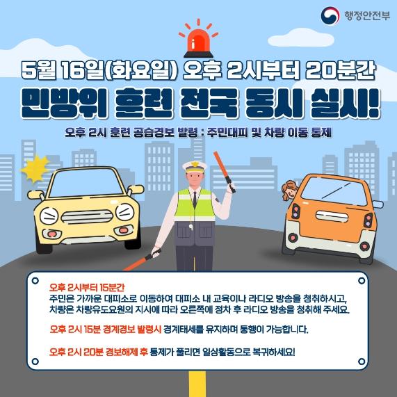 [한국쇼핑몰뉴스, 최영진기자] 행정안전부는 북한의 미사일 도발, 러시아-우크라이나 전쟁 등 한반도의 안보 위협이 고조됨에 따라 비상시 국가 대응 역량을 강화하기 위해 오는 5월 16일 오후 2시부터 20분간 민방위훈련을 전국 동시에 실시한다고 밝혔다.