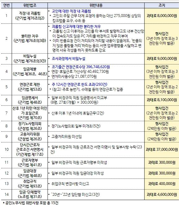 그밖에도 장수농협은 조기출근에 대해 연장근로수당을 지급하지 않는 등 4억원이 넘는 “공짜 노동”과 1주 12시간 연장근로 한도를 총 293회 위반하는 등 노동관계법 위반사항도 다수 확인했다. 고용노동부 전주지청은 특별근로감독 결과 노동관계법 위반사항에 대해 형사입건 6건, 과태료 총 6천 7백만 원 부과 등의 법적조치를 했으며, 괴롭힘 행위자 4명에 대해서는 사측에 징계를 요구하고 그 결과를 제출하도록 했다. 아울러, 공인노무사법상 성실?비밀엄수 의무 등 위반을 이유로 해당 공인노무사에 대해서는 징계를 요구할 계획이다.