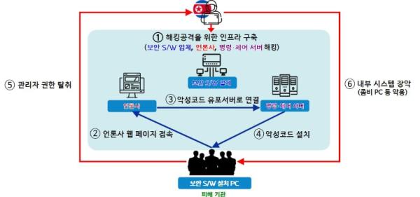 수사 결과, 북한은 지난 2021년 4월 국내 유명 금융보안인증 업체를 해킹하여 소프트웨어의 취약점을 찾아내고, 공격에 활용할 웹 서버와 명령·제어 경유지 등 공격 인프라를 장기간 치밀하게 준비한 것으로 확인됐다.