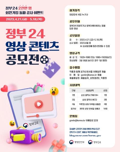 ‘정부24 영상 콘텐츠’ 공모전도 진행된다. 행정기관 방문 없이 민원 업무 보기와 같은 국민 생활 속에서 편리하게 사용한 정부24 서비스를 영상 콘텐츠로 응모하면 심사를 통해 사은품을 증정한다.