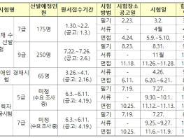 오는 1월 30일 7급 지역인재 선발시험부터 원서접수 일정이 시작되며, 이어 중증장애인 경채시험 3월 26일, 5·7급 민간경력자 일괄채용시험 6월 3일, 9급 지역인재 수습직원 선발시험이 7월 22일에 각각 진행된다.