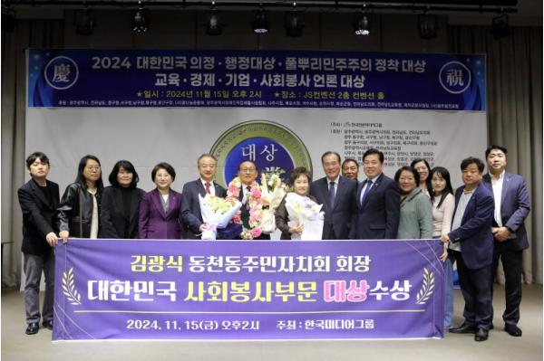 [한국쇼핑몰뉴스, 최영진기자] 2024년 11월 15일, 광주 서구 상무지구 JS컨벤션 2층에서 열린 한국언론미디어그룹의 8주년 기념식 및 대한민국 의정대상 시상식에서 김광식 동천동주민자치회장이 '2024 대한민국 봉사대상' 사회봉사 부문에서 수상했다.