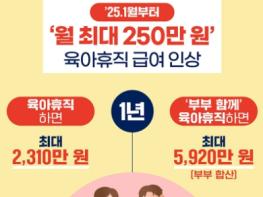 부부가 1년 간 육아휴직 하면 각각 2,960만 원씩, 총 5,920만원을 받을 수 있습니다.?한부모 근로자 첫 3개월 육아휴직 급여는 월 상한액을 250만 원에서 300만 원으로 올립니다.