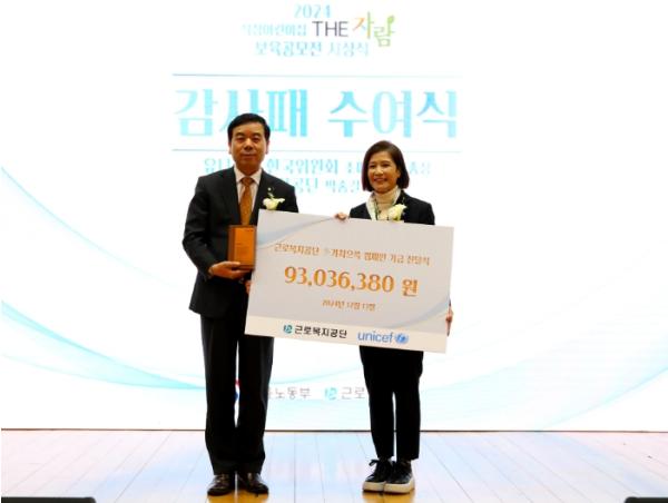 [한국쇼핑몰뉴스, 최영진기자] 고용노동부 근로복지공단은 전국 직장어린이집의 사회가치경영(ESG) 실천 행사인 ‘다(多)가치 으쓱(ESG) 행사’를 통해 전달받은 수익금 93백만원(2년간 누적 1억8천만원)을 유니세프 한국위원회에 기부했다고 밝혔다.